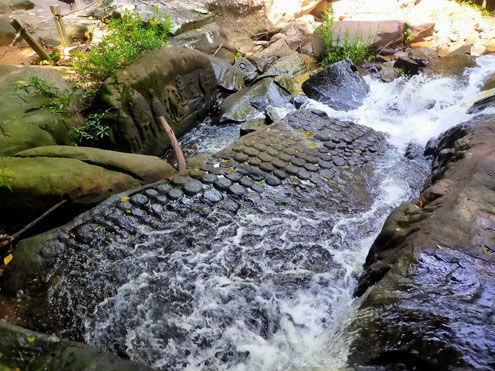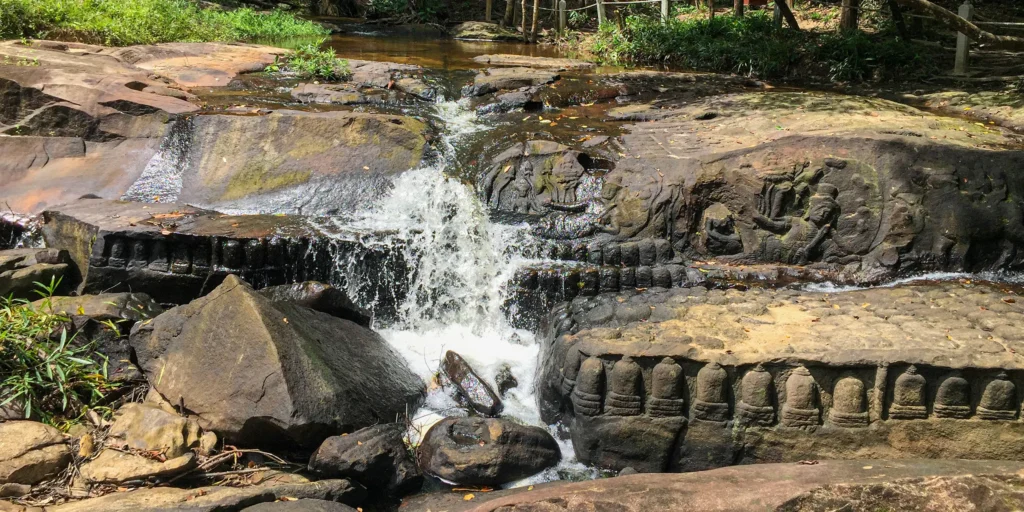 クバール・スピアン山の水中遺跡は、シェムリアップ川の源流に位置し、神聖な空気が漂う深い密林の中にあります。