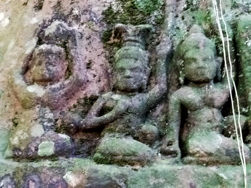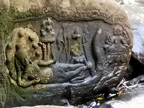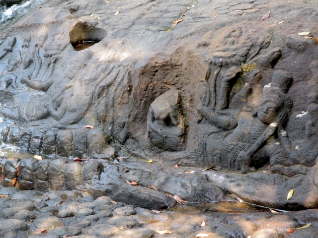 山中には川底に刻まれたヴィシュヌ神や無数のリンガ(男性神の象徴)など、神聖なレリーフが点在しています。