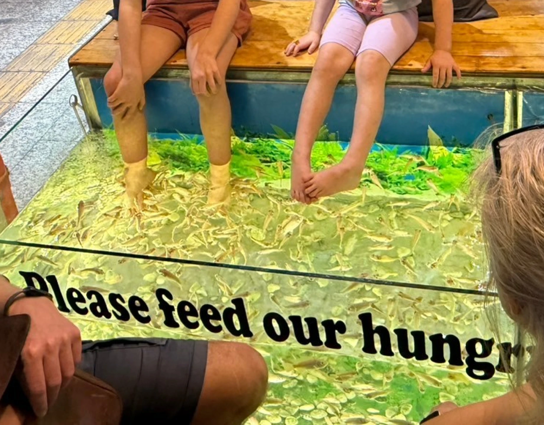 パブストリート周辺でドクターフィッシュのフィッシュマッサージを体験してみてはいかがでしょうか。水槽に足を浸けると、ドクターフィッシュが足の古い角質を食べてくれます。初めはくすぐったい感覚がありますが、次第に慣れてリラックス効果を感じられます。足に傷やかさぶたがある場合、ドクターフィッシュがその部分に集中的に食いつくことがあり、痛みを感じる可能性があるため、注意をしてくださいね。