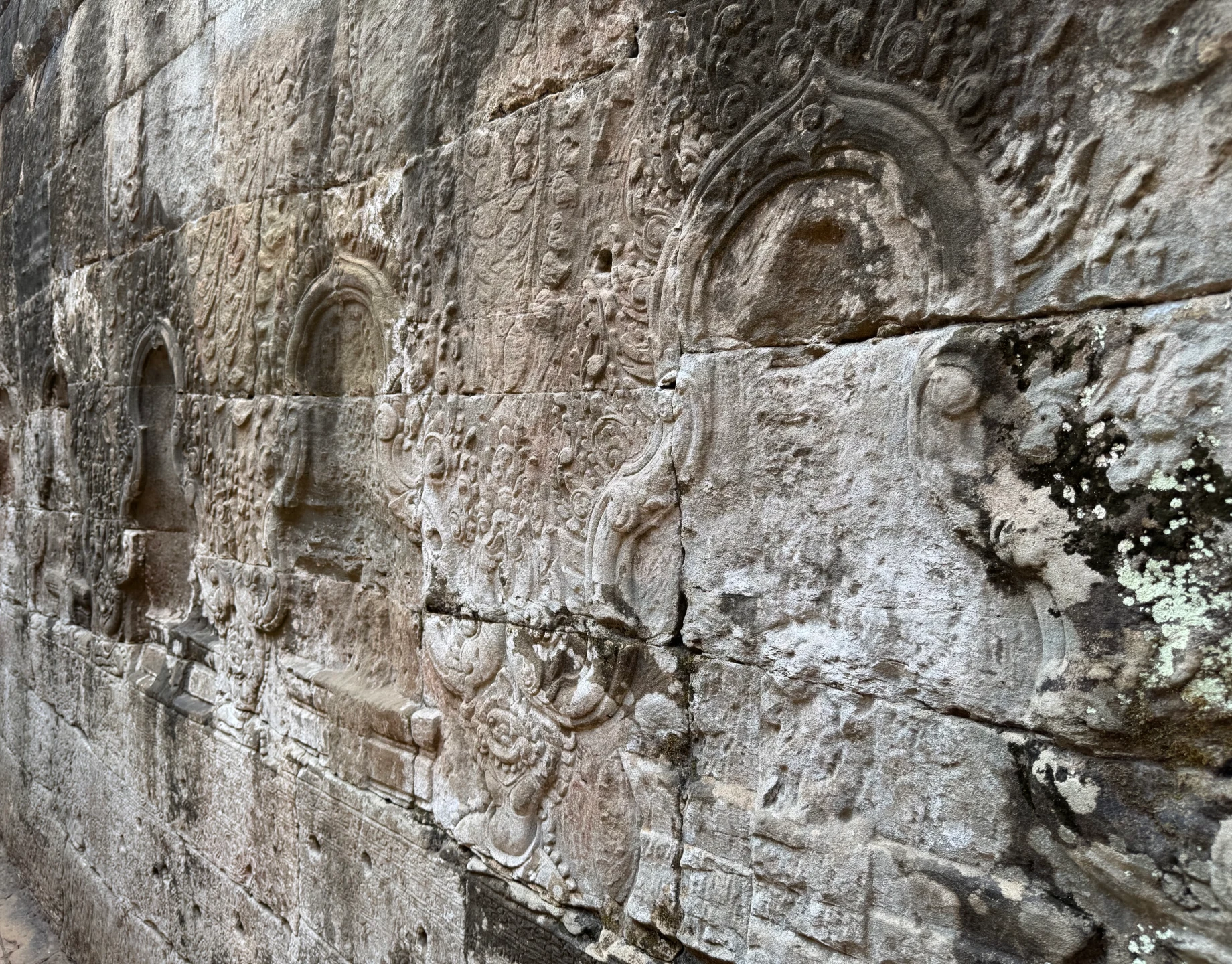 カンボジアで遺跡巡りをしていると、上記の写真のような不思議な光景に出会うことがあります。勘の良い方は違和感を感じるかもしれませんが、なんの知識もなしに見ていてたら、疑問も持たずに通り過ぎてしまう光景かもしれません。これは、かつて観音菩薩が彫られていた壁面でした。しかし、観音像の部分だけが削り落とされ、まるで“消された存在”のように跡形もなくなっています。