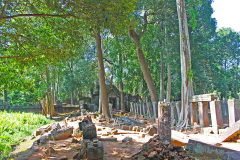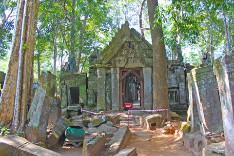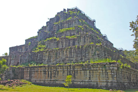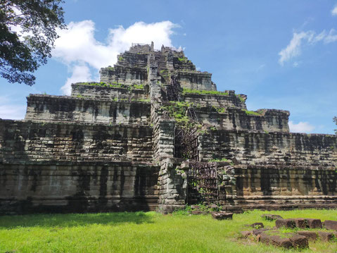 皆様コーケー遺跡群に行ったことがありますか。コーケー遺跡群はプレアヴィヒア州にございます。シエムリアップ州の北東に位置して、113キロで、車で2時間20分ぐらいかかります。この遺跡はピラミッド型で、高さは35メートルです。こちらはジャヤーヴアルマン4世によって建てられたヒンドゥー教の遺跡でございます。921年から944年までの都です。その後はラジェンドラヴアルマン2世がアンコールトムのへんに戻りました。戻ってから東メーボン遺跡とプレループ遺跡とバンテアイスレイ遺跡を建てられました。東メーボン遺跡952年に建てられて、プレループ遺跡は961年に建てられて、バンテアイスレイ遺跡は967年に建てられたんです。