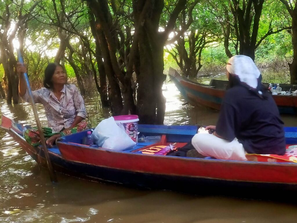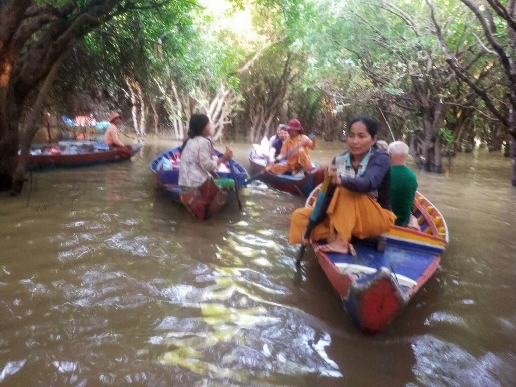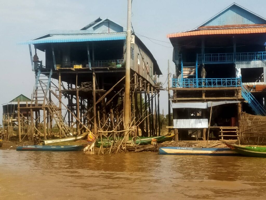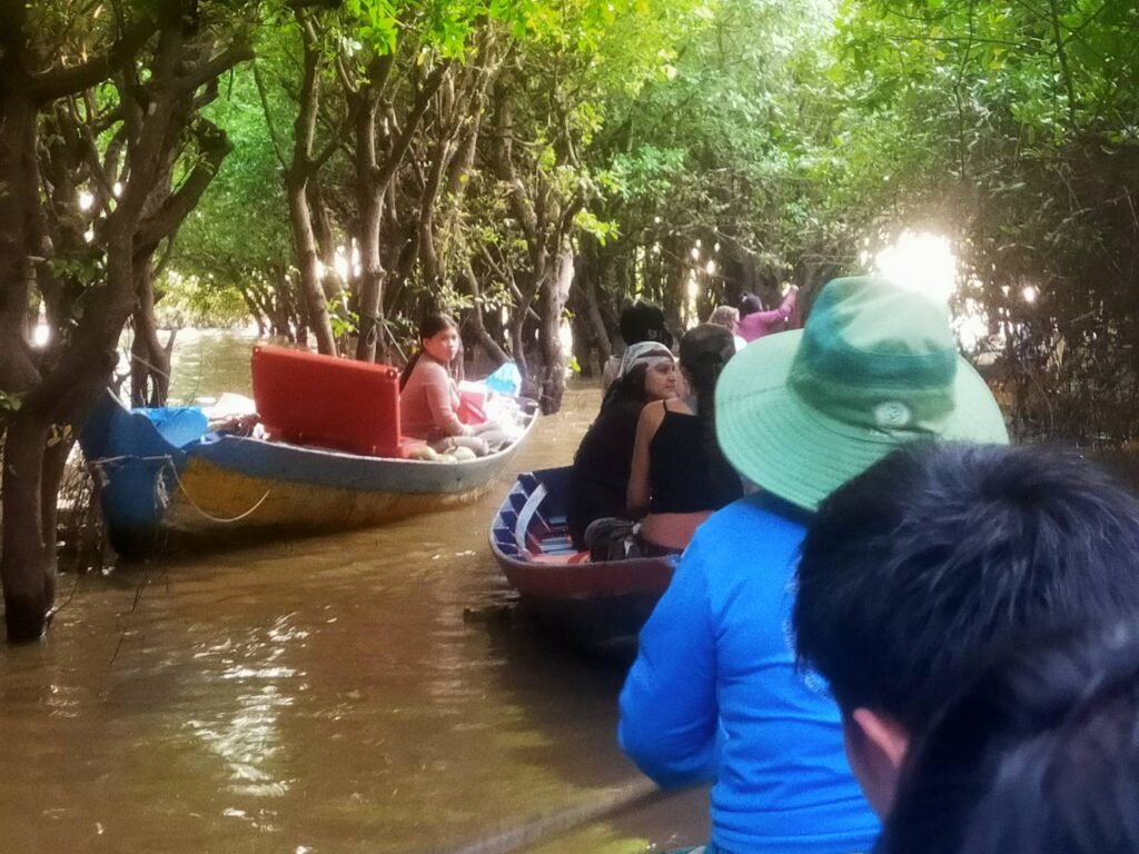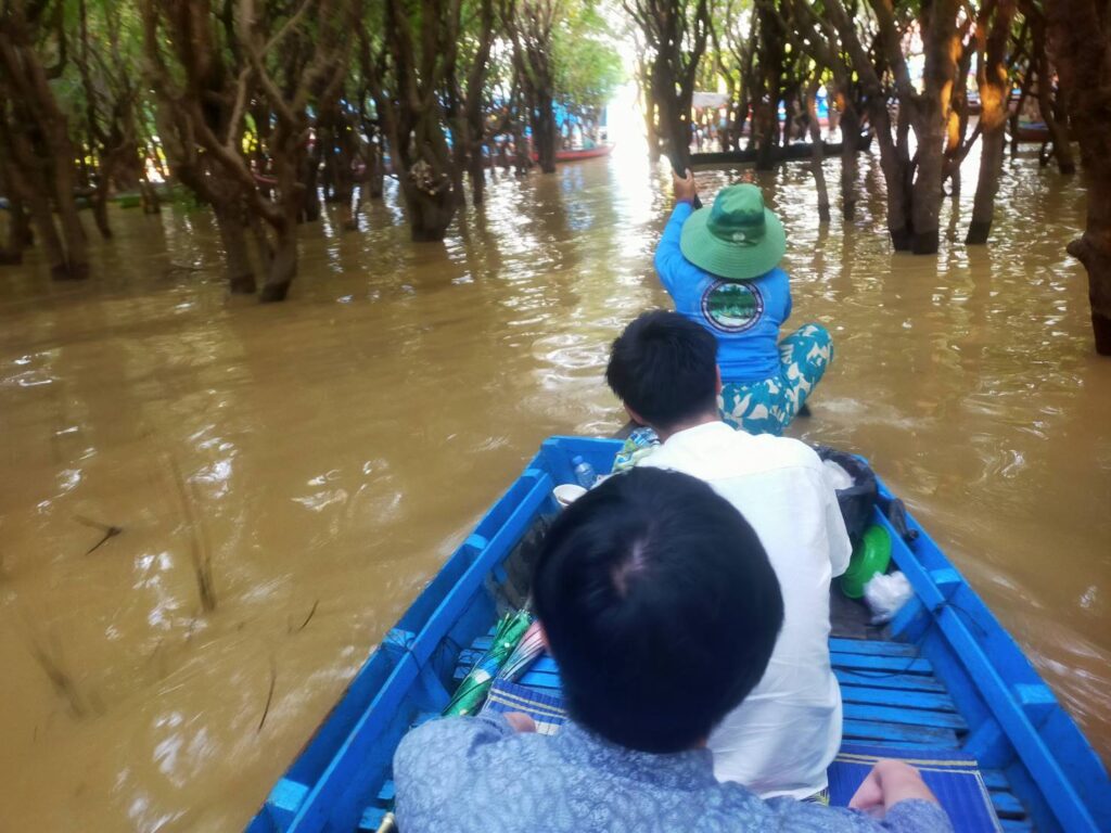 シエムリアップ州ではトンレサップ湖のコミュニティは4ヶ所ございます。メイチュレイ、チョンクニアー、カンポンプルック、コンポンクリアンです。この間はカンポンプルックと言うコンミュニテイに行って来ました。こちらは高い床式の家がとっても面白かったです。高い床式の家以外は小さい船に乗れるんです。漕いでくれる人がいるんです。マングローブ林の中にぐるっと回ってくれました。私は初めてマングローブ林の中に船に乗ってとても感動しました。皆様カンボジアに旅行したら、ぜひマングローブ林で小さい船に乗ってください。