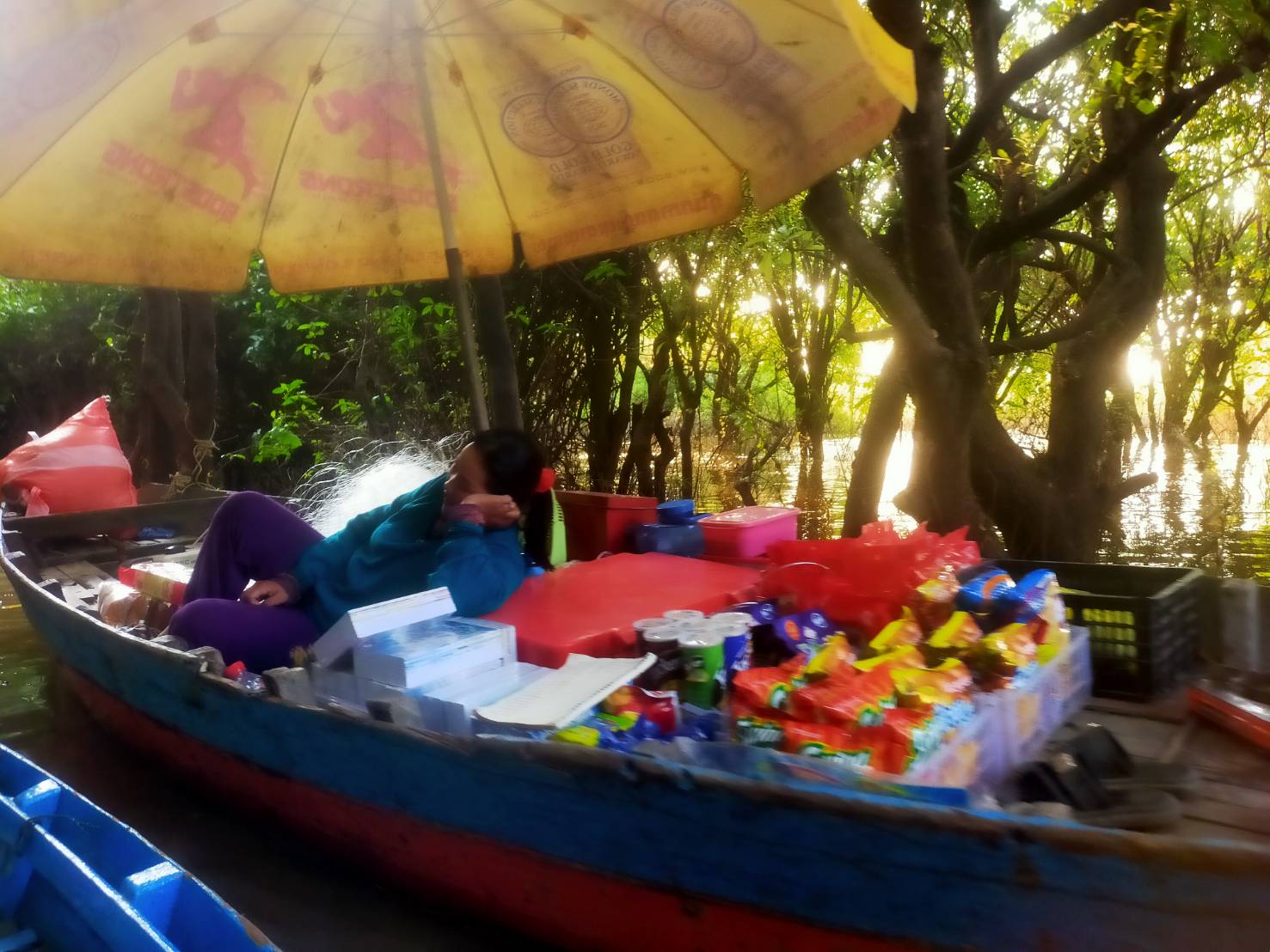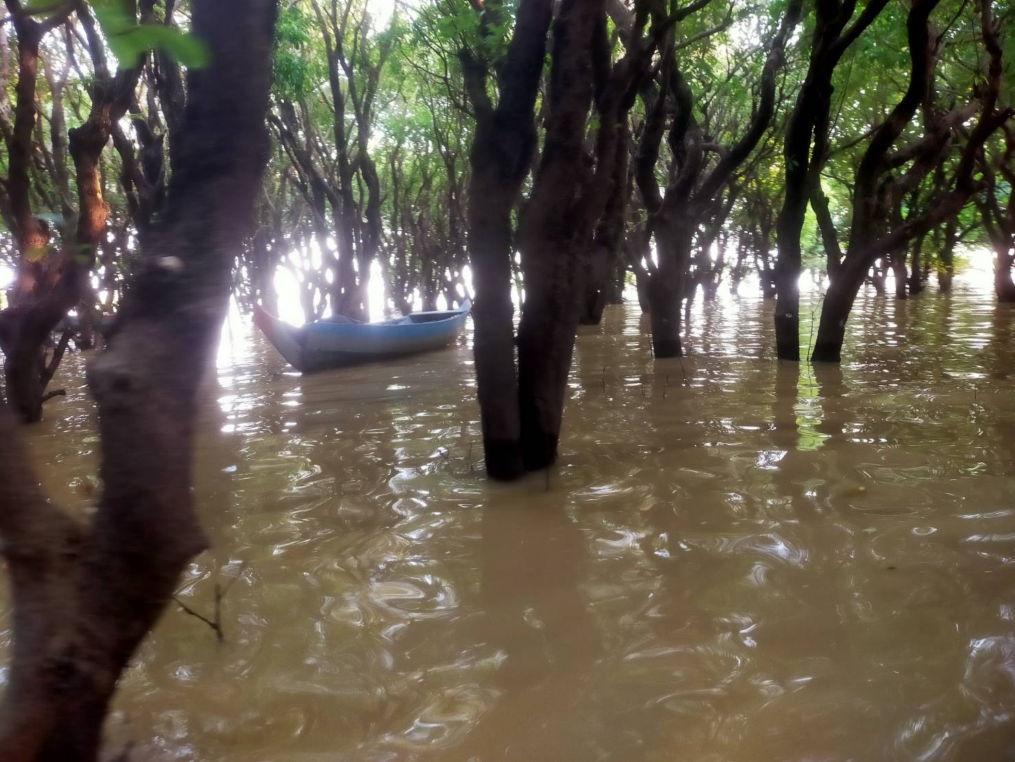 シエムリアップ州ではトンレサップ湖のコミュニティは4ヶ所ございます。メイチュレイ、チョンクニアー、カンポンプルック、コンポンクリアンです。この間はカンポンプルックと言うコンミュニテイに行って来ました。こちらは高い床式の家がとっても面白かったです。高い床式の家以外は小さい船に乗れるんです。漕いでくれる人がいるんです。マングローブ林の中にぐるっと回ってくれました。私は初めてマングローブ林の中に船に乗ってとても感動しました。皆様カンボジアに旅行したら、ぜひマングローブ林で小さい船に乗ってください。
