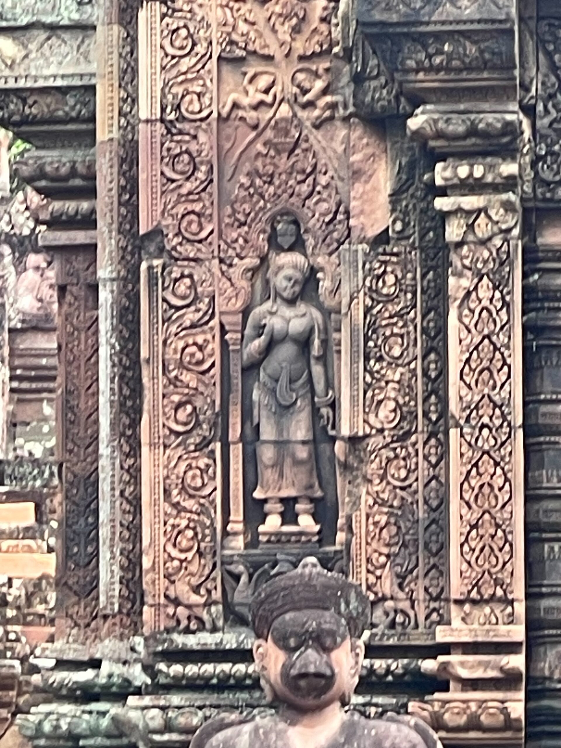 皆様こんにちは。皆様カンボジアに旅行したことがありますか。カンボジアは遺跡が多いです。有名な遺跡も多いです。例えばアンコールワット、アンコールトム、タプローム寺院などです。実は全国に1080ございます。でも、1080遺跡の中に東洋のモナ・リザと呼ばれるバンテアイスレイ遺跡だけ珍しいです。この遺跡だけ赤い石で建てられたんです。ほかの遺跡は大体白い砂岩で建てられたんですよ。彫刻も細かくてきれいです。シエムリアップ町から36キロぐらいでちょっと遠いですけど毎日観光客が多いですよ。プノンペンの人はシエムリアップ州に来たらいつも子供たちを連れて行くんです。皆様カンボジアにいらっしゃったらぜひバンテアイスレイ遺跡まで観光ください。