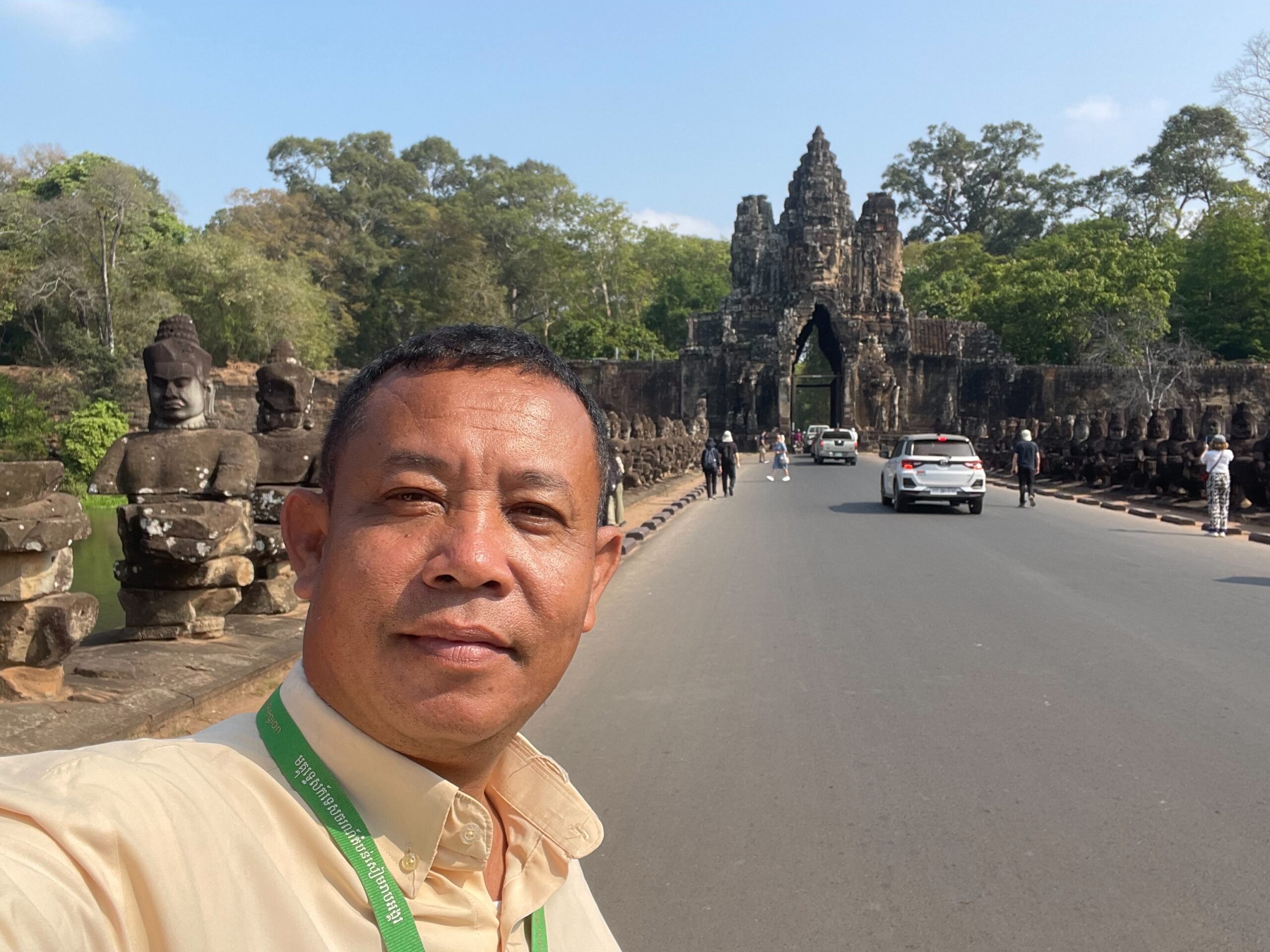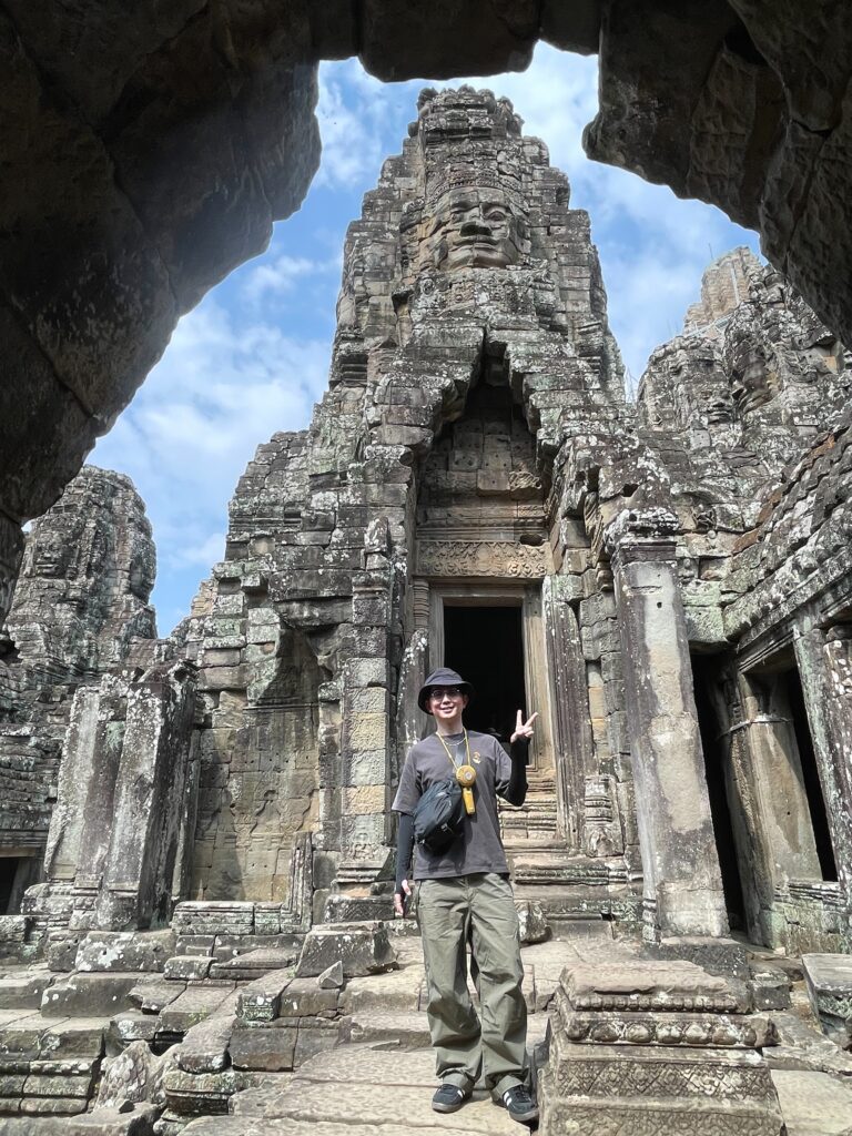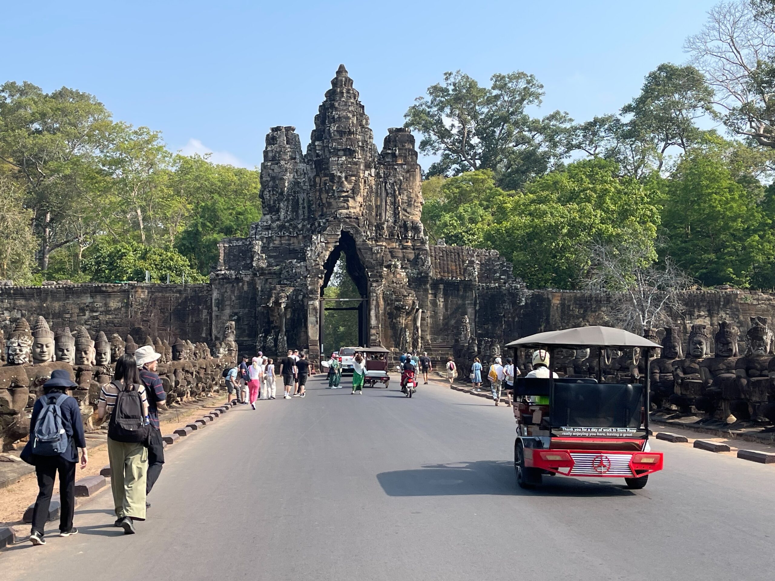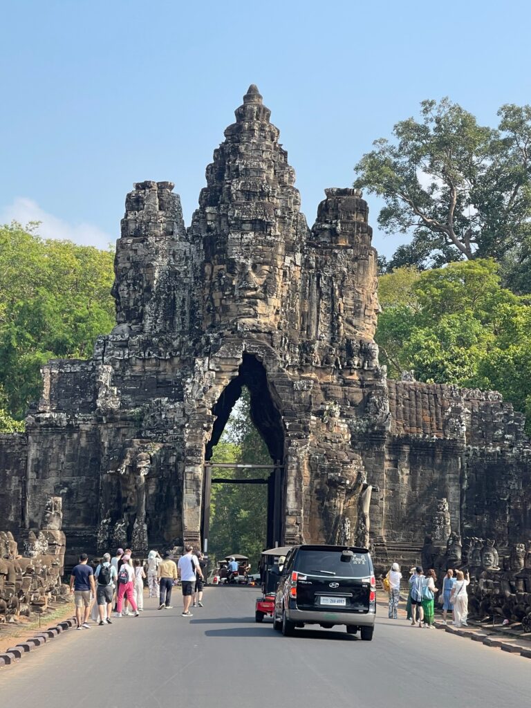 アンコールトムは12世紀の後半にジャヤーヴアルマン7世と言う王様によって建てられたカンボジアの古都です。アンコールトムは門が五つございます。東は門が二つございます。死者の門と勝利と呼ばれます。アンコール時代の軍人が死んだときは死者の門から入って、勝ったときは勝利の門から入ったんだ、北の門は偉い人のためで、南の門は一般的な人のためで、西の門は拷問する時に使ったもんです。記録によるアンコールトムのなでは人が一万七千人住んでいたそうです。王様の王宮もアンコールトムの中にございましたよ。でも、木造の建物なのでプノンペンに遷都した時にプノンペンに持って行っちゃったんだ。
