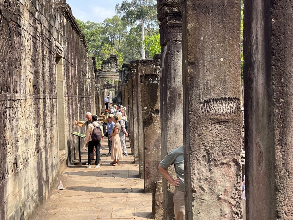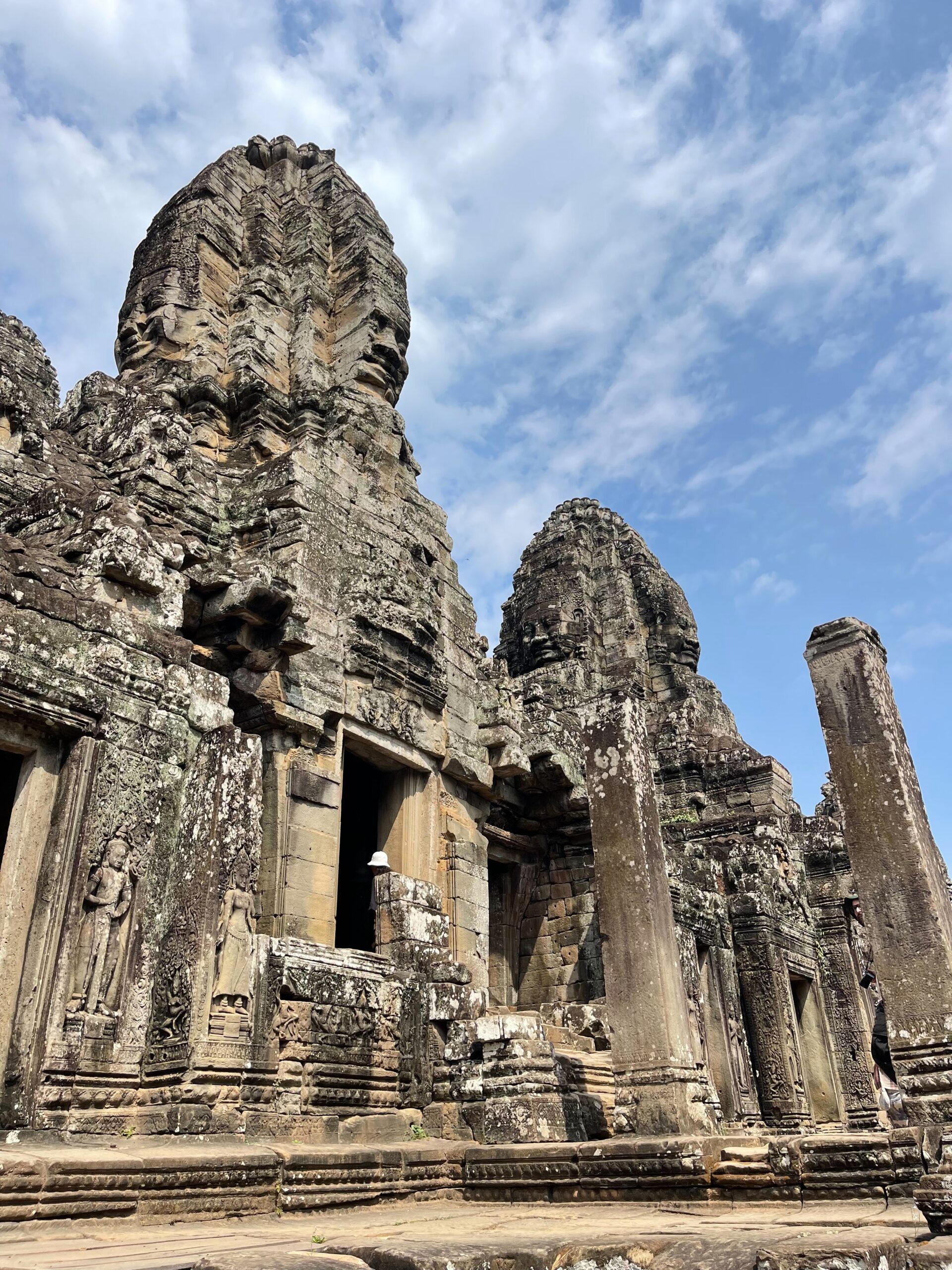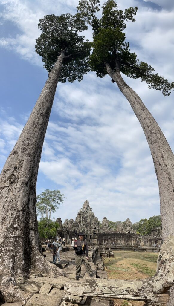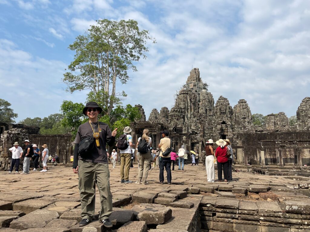 アンコールトムは12世紀の後半にジャヤーヴアルマン7世と言う王様によって建てられたカンボジアの古都です。アンコールトムは門が五つございます。東は門が二つございます。死者の門と勝利と呼ばれます。アンコール時代の軍人が死んだときは死者の門から入って、勝ったときは勝利の門から入ったんだ、北の門は偉い人のためで、南の門は一般的な人のためで、西の門は拷問する時に使ったもんです。記録によるアンコールトムのなでは人が一万七千人住んでいたそうです。王様の王宮もアンコールトムの中にございましたよ。でも、木造の建物なのでプノンペンに遷都した時にプノンペンに持って行っちゃったんだ。
